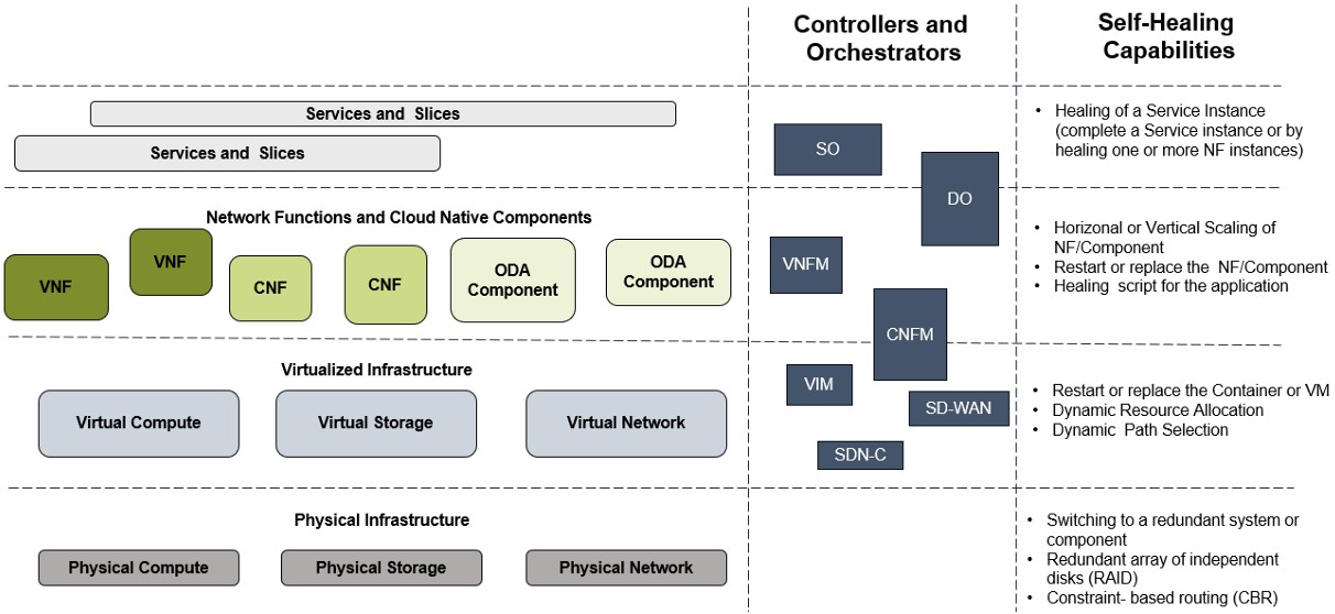 3. 服務管理層:專注維持SLA與服務可用性。當功能失效時,系統能啟動備援機制、執行流量重導,並調整資源配置,確保服務不中斷、品質不下降,即使底層出現局部異常。目標是確保用戶的服務不中斷、品質不下降,即便背後基礎設施出現局部障礙。對應圖2中Controllers and Orchestrators區塊的SO。