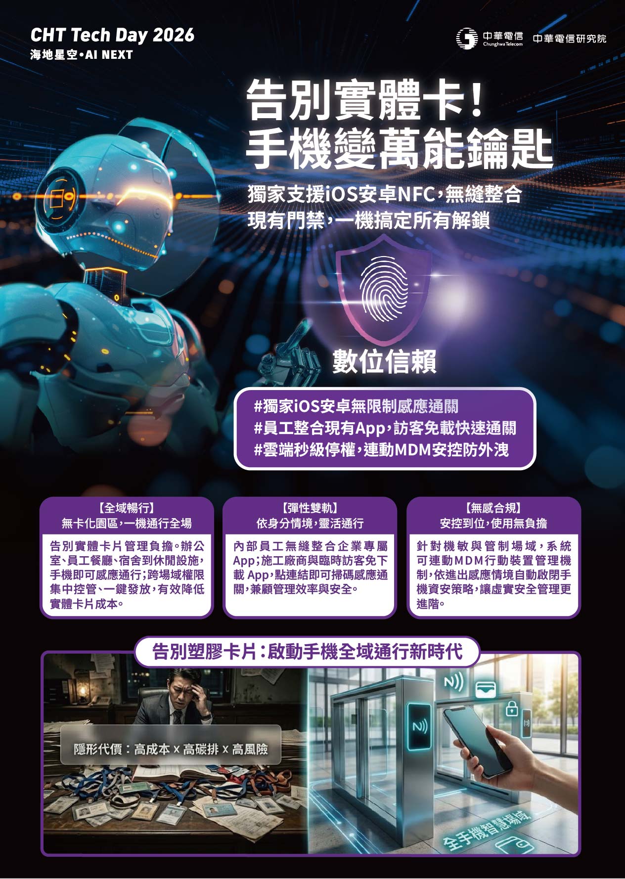 本技術今年起已全面支援「手機感應」,取代傳統實體門禁卡與識別證!這套一站式的數位卡片解決方案,不僅具備遠端鎖卡與防破解的高安全性,支援訪客通行與跨區權限控管。更重要的是,它大幅減少了實體塑膠卡片的發行與碳足跡,完美詮釋中華電信如何以科技帶動企業永續經營。已與國內數家知名安防系統整合商合作,協助企業客戶、學校與社區大樓將各類門禁卡、識別證與實體鑰匙,升級為用手機即可通行的行動化服務,讓既有通行管理更簡單、更便利。