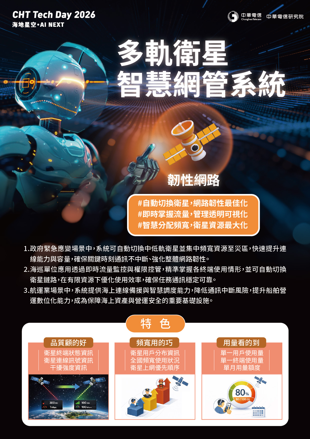 中華電信持續打造「海地星空」數位韌性基礎,全面提升台灣整體通訊韌性。但面對極端氣候與地緣政治風險升高,通訊網路基礎管理的韌性,亦成為支撐各項智慧應用發展的關鍵命脈。本方案透過即時且主動的衛星終端設備監控與管理機制,強化多重備援體系的維運能力,打造穩定可靠的立體防護網。藉由完善的備援架構與智慧化管理機制,確保關鍵時刻通訊服務不中斷,使台灣在任何突發變局下皆能維持對外連線能力,絕不成為通訊孤島。