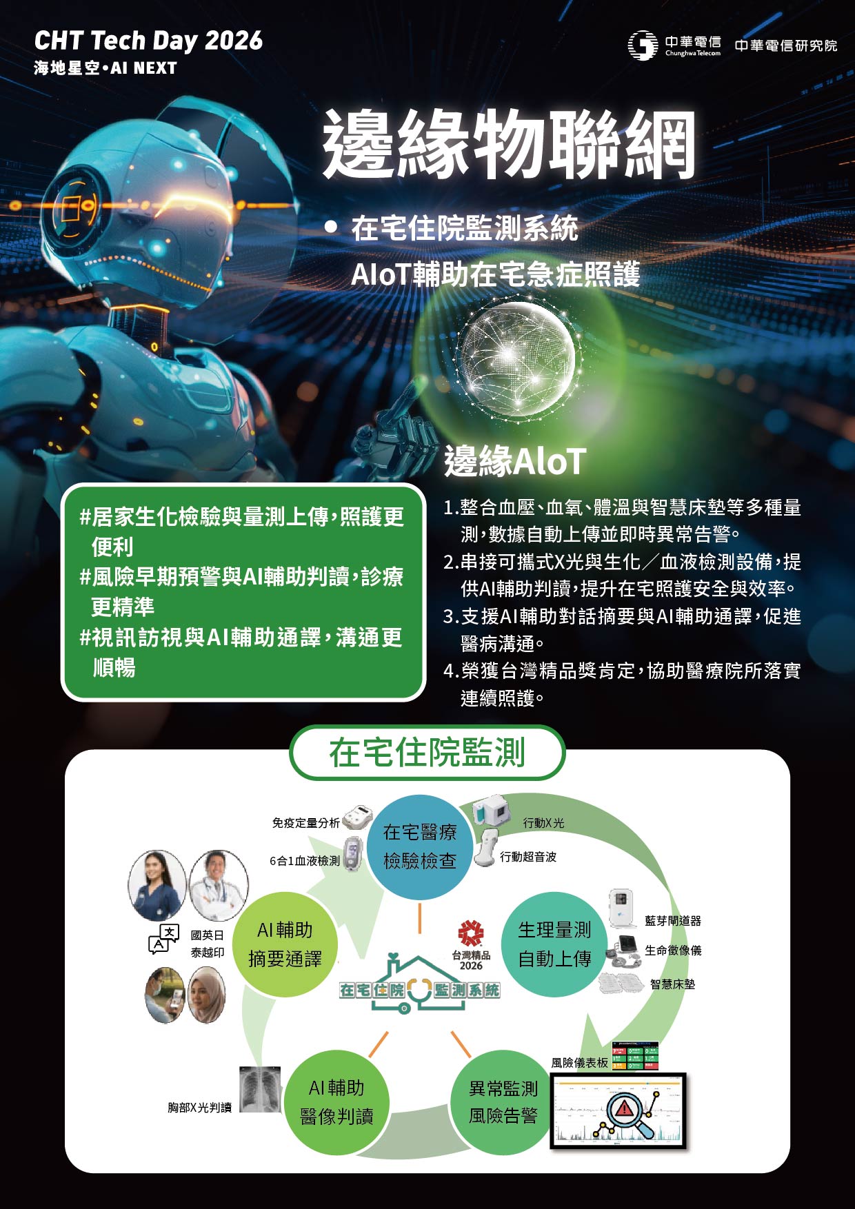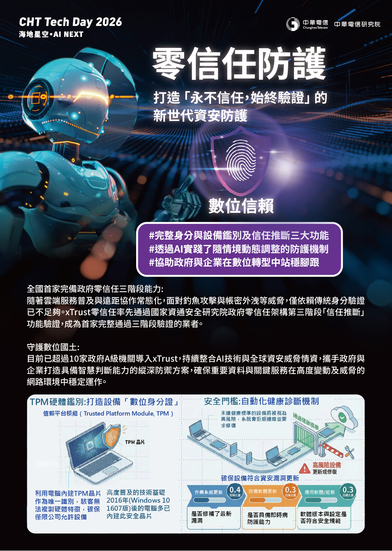 中華電信今(24)日盛大舉辦「CHT Tech Day 2026 研發成果發表會」,由中華電信研究院以「海地星空 AI NEXT」為活動主軸,展示「韌性網路、邊緣 AIoT、AI 代理、數位信賴」4大科技領域,發表 9 項具高度商業價值的前瞻研發成果。本次發表跳脫純技術展示,全面聚焦具備服務能力及可彈性整合特性的應用,展現技術落地與跨產業生態圈建構的決心。