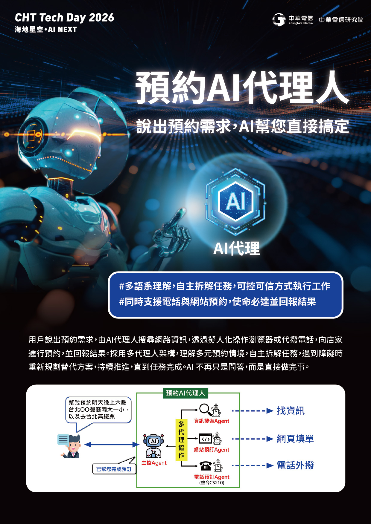 有別於傳統以被動回應為主的聊天機器人,本技術具備自主拆解任務、靈活應變及動態決策的能力,可協同搜尋、網頁操作與語音通話等多個代理人機制,各司其職完成複雜任務。使用者只要說一句話,AI 即可協助完成高鐵訂票、餐廳訂位等任務;當遇到客滿或突發狀況時,系統亦能即時重新規劃替代方案,真正實現「AI 全權代勞」的智慧生活。