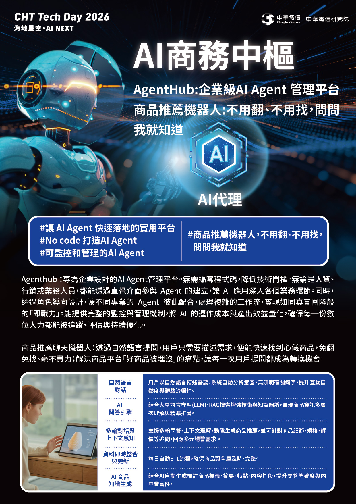 為降低企業導入 AI 門檻的技術門檻,本技術提供強大的 AI 多代理人建置、協作與監控治理能力,企業只需透過 No-Code(無程式碼)的網頁介面,就能在極短時間內快速打造如「虛擬 HR 招募團隊」或「智慧核保助理」等多代理人工作流程,提高企業作業效率及決策品質。不僅大幅減輕人工作業負擔,更將 AI 研發能量無縫轉化為支援企業營運的即戰力,加速企業AI智慧轉型。該技術正與政府機關合作,確保機關內部營運流程透明、可追蹤、可治理,共同努力將 AI 轉化成營運戰力。